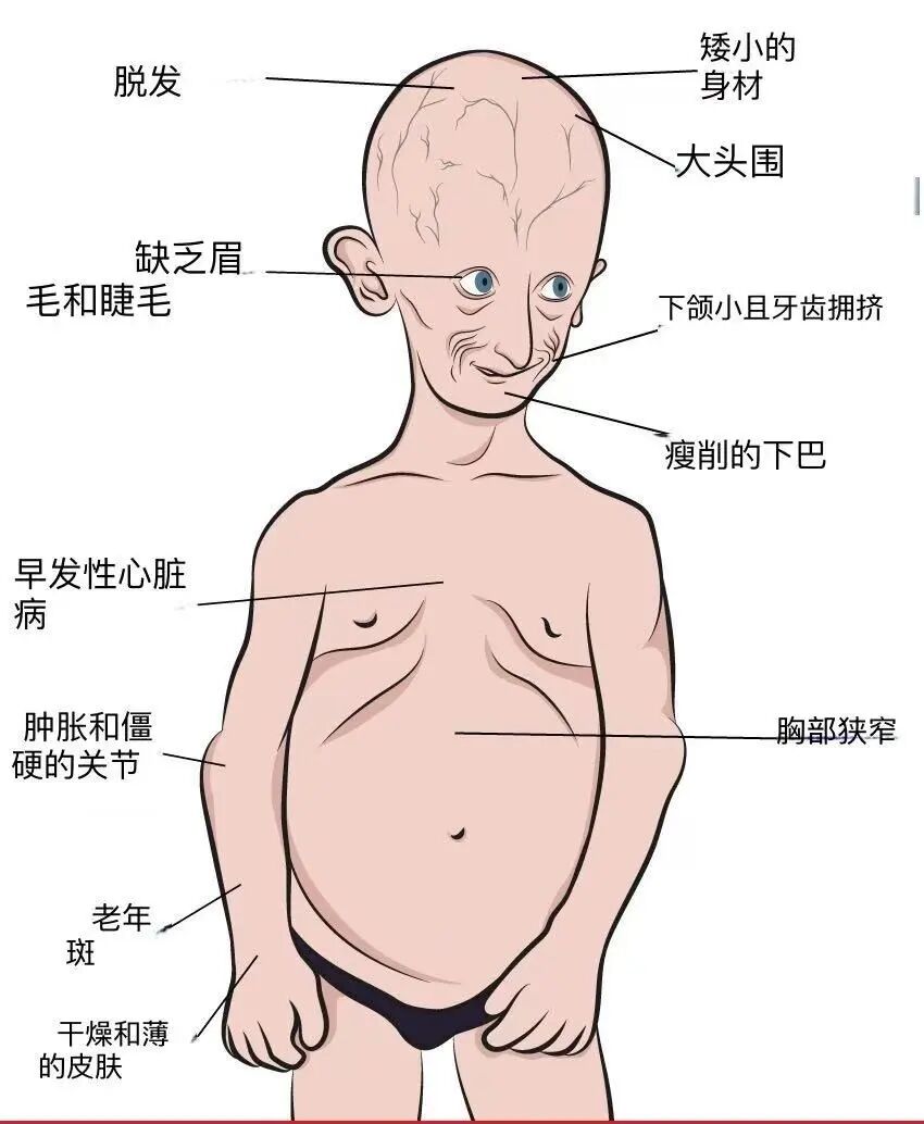 早年衰老综合症,简称早老症,患者出生时一般并无异常,但在2岁以内会忽然加速衰老。等长到10岁左右时,他们的外貌看起来就像七八十岁一样:身材矮小干瘪,没有头发,皮肤布满皱纹,血管突出地暴露在皮肤表面,关节和骨骼也非常脆弱。