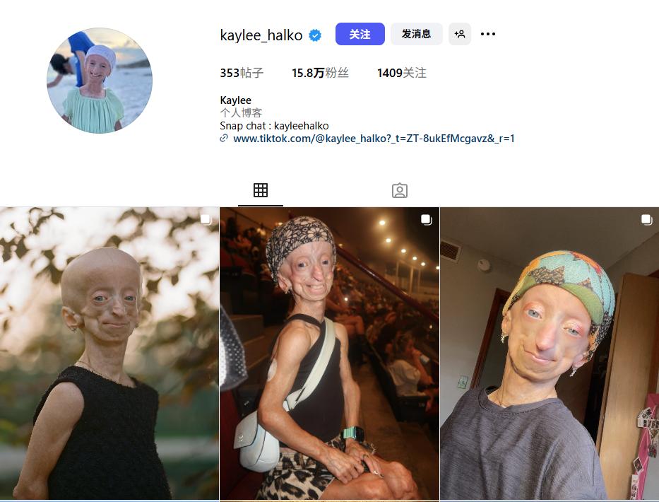 2003年出生的凯莉·哈尔科(Kaylee Halko)也是一名早老症患者,因为勇敢地在社交媒体分享自己的病情与生活,收获了15.8万个粉丝。