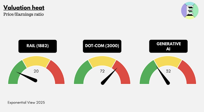 如今,情况要平静得多。纳斯达克的市盈率约为32,是互联网时代的一半。更广泛的科技市场估值高于长期平均水平,但远未达到互联网泡沫的程度。与铁路泡沫时期估计约20的市盈率相比,现在的估值偏高。但铁路泡沫的结局很糟,不是因为估值本身极端,而是因为收入增长停滞。相比之下,生成式AI的收入仍在快速加速增长。