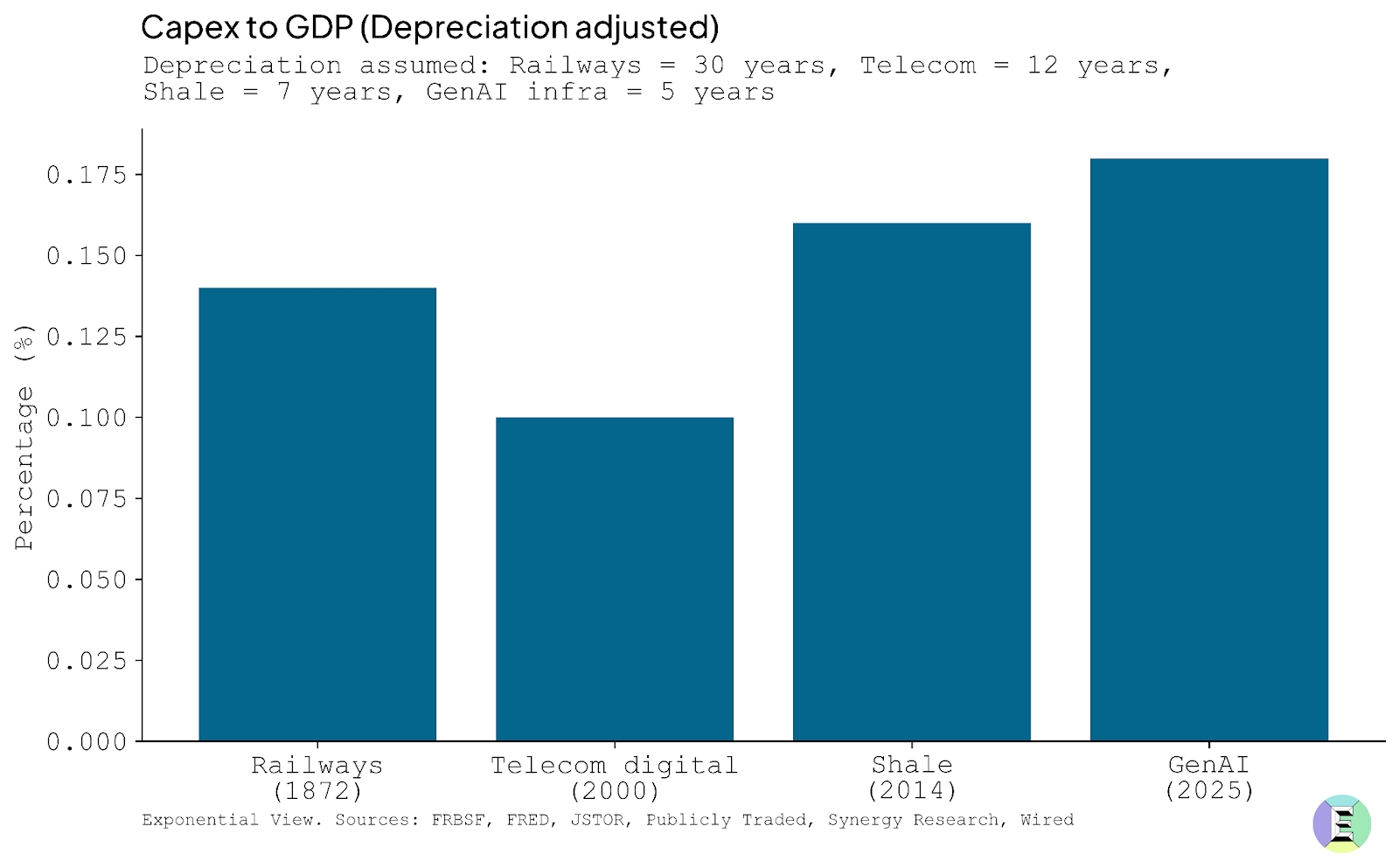 在1872年美国铁路扩张的高峰期,资本支出约为收入的两倍。1990年代末爆发电信泡沫时,资本支出略低于收入的四倍。相比之下,当今的生成式AI热潮,收入约为600亿美元,而全球数据中心资本支出约为3700亿美元——资本支出与收入之比为六倍,是最为紧张的一次。
