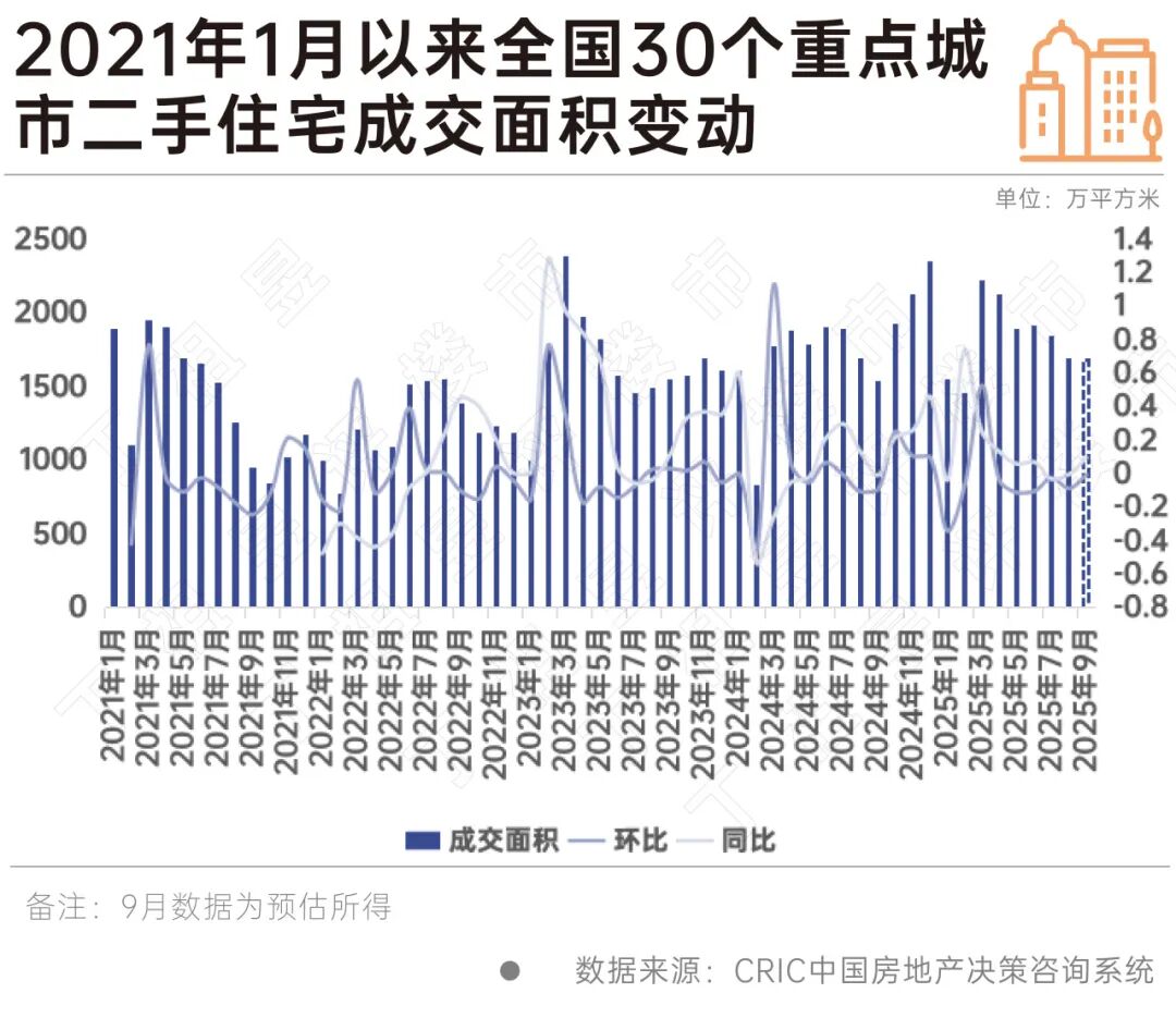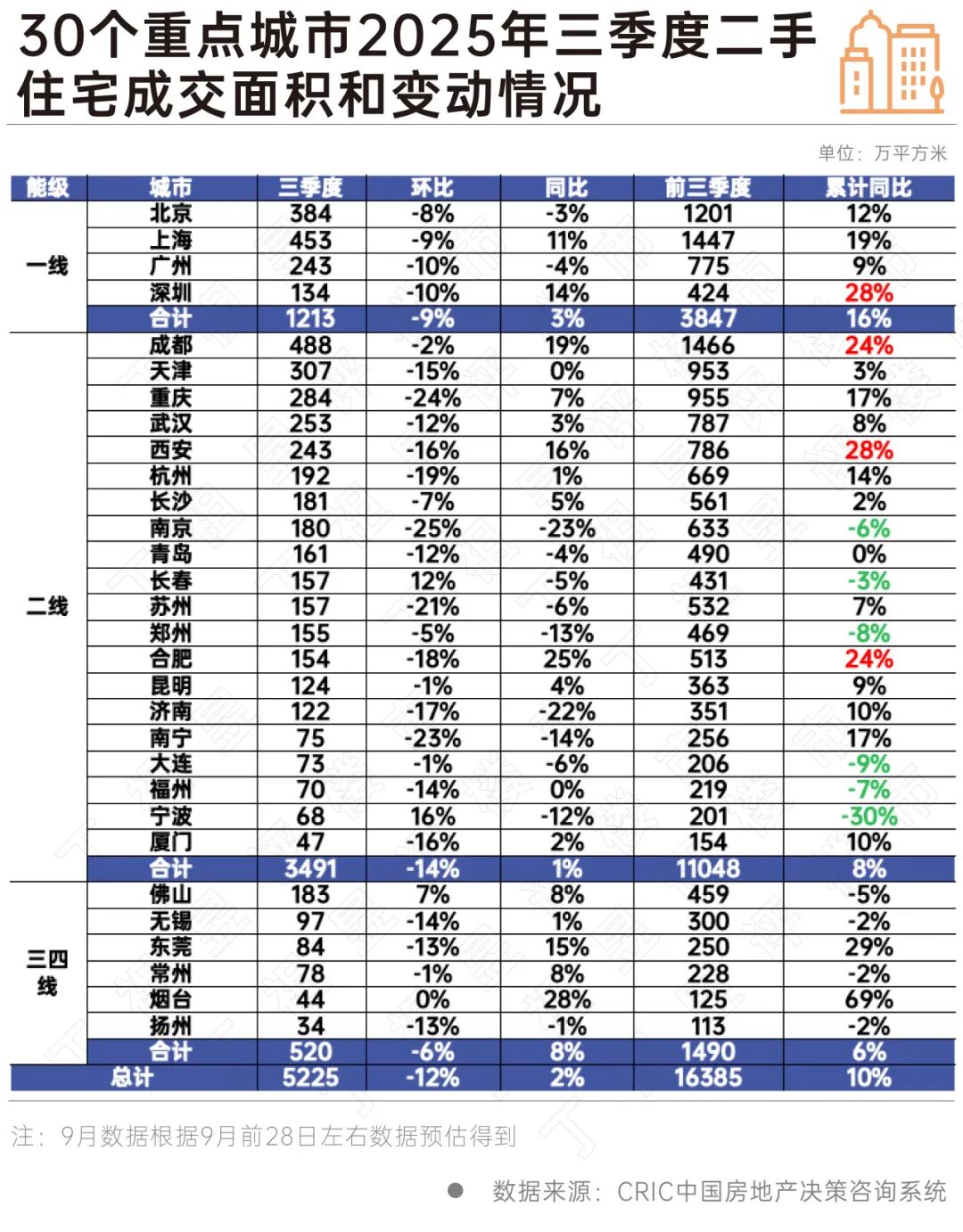2025年三季度,30个重点监测城市二手房累计成交面积预计为5225万平方米,环比下降12%,同比增长2%,累计同比增长10%。