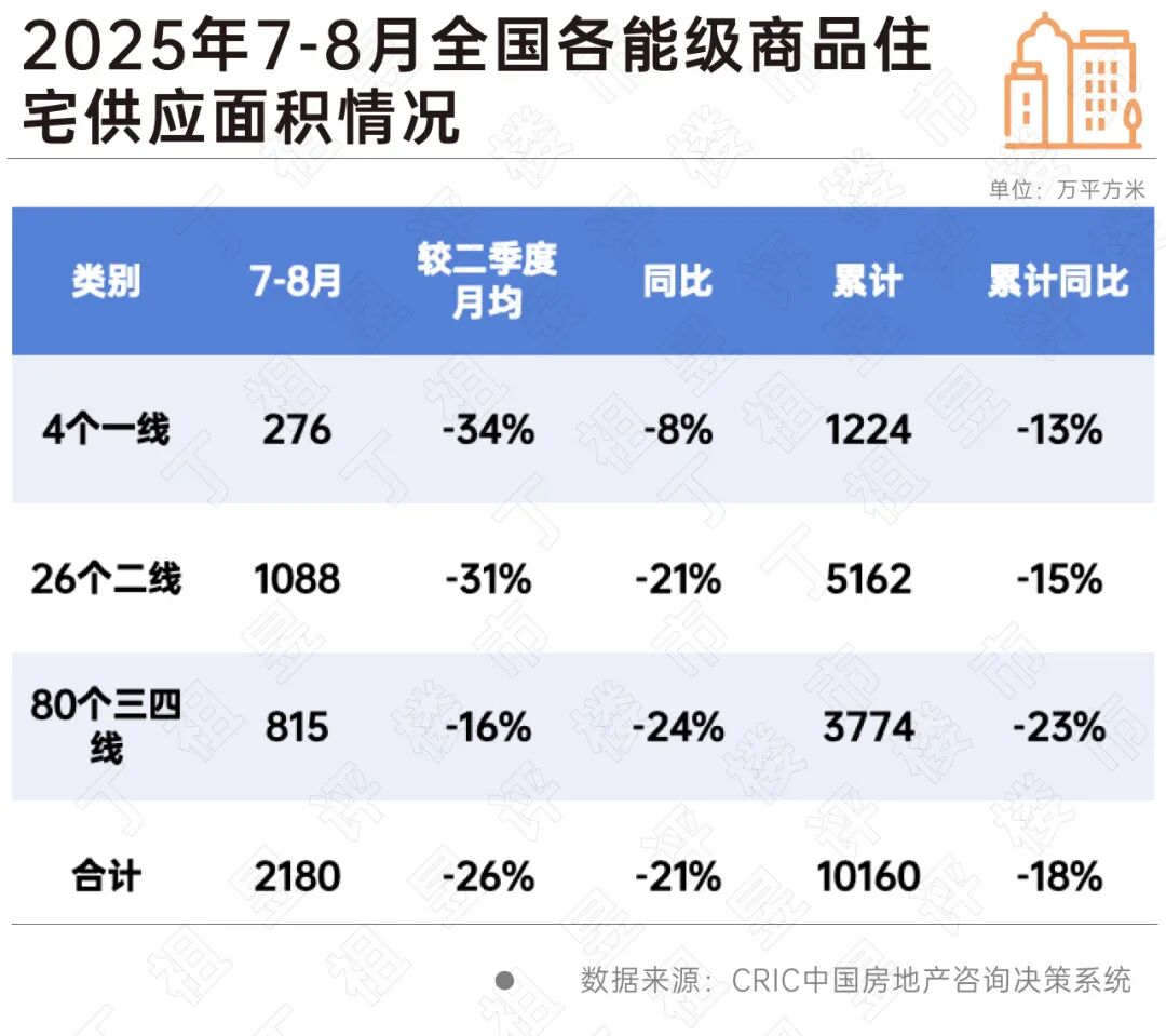 2025年三季度供应季节性回落,同环比齐跌,前三季度全国商品住宅供应约束依旧显著:据CRIC监测,7-8月全国110个重点城市新增供应2180万平方米,同比下降21%,较2025年二季度月均下降26%。