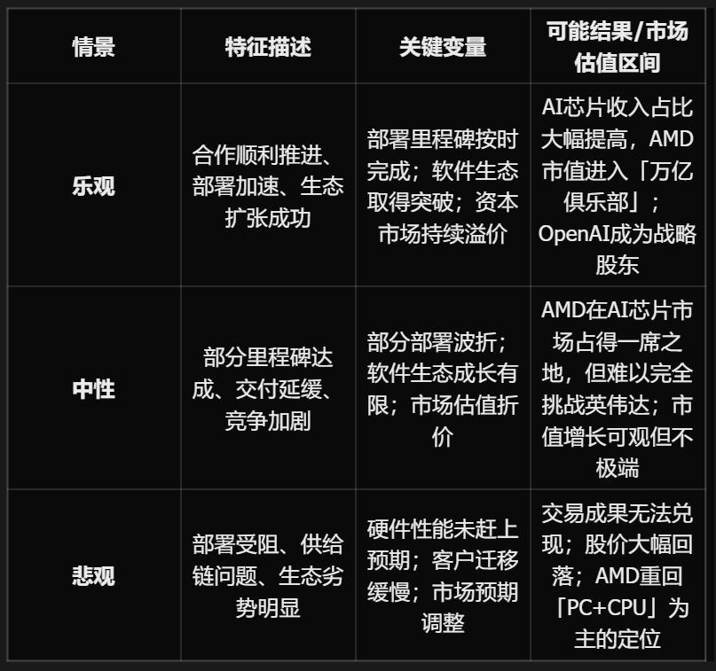 为了便于理解,我们将AMD与OpenAI合作后的未来走势,拆成三种典型情景:乐观、中性、悲观。