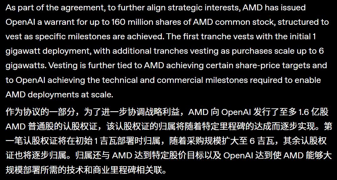 当OpenAI与AMD签署涵盖6GW芯片供给+认股权证的合作协议时,更像是一记「战略炸弹」,可能撬动出AI硬件生态的新秩序。对于AMD而言,这是一次从追赶者到潜在「核算力玩家」的重塑,风险与机遇并存。