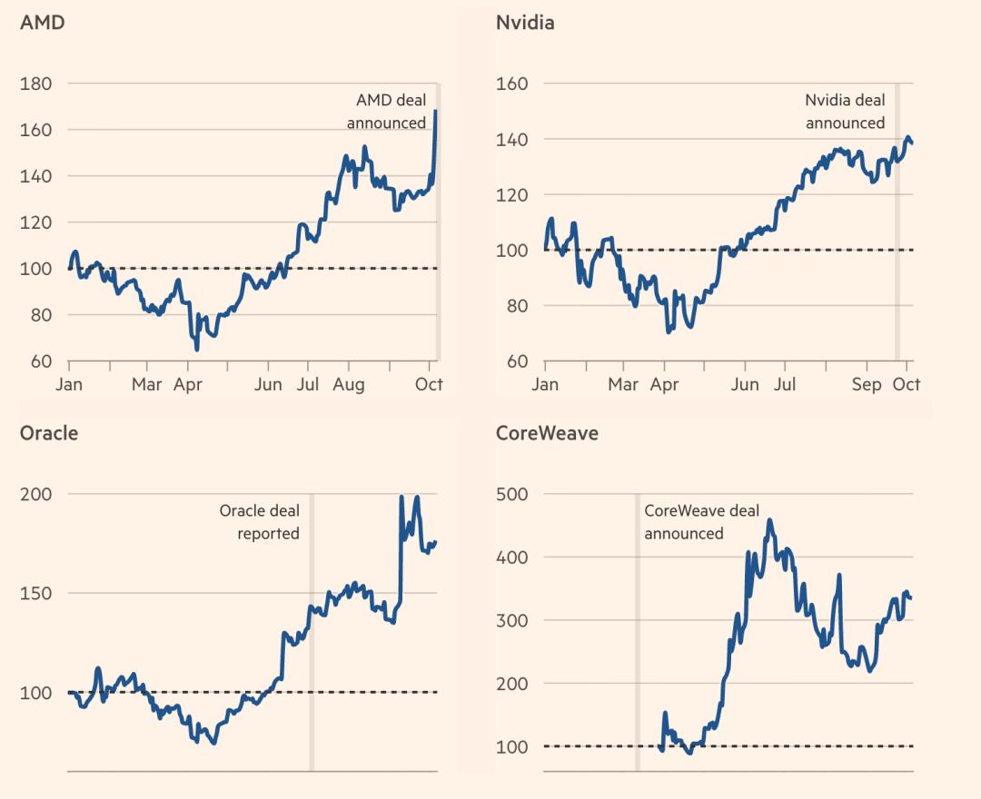 早一些的比如甲骨文(Oracle)、英伟达、CoreWeave,最近的比如独创「股换芯」的AMD。