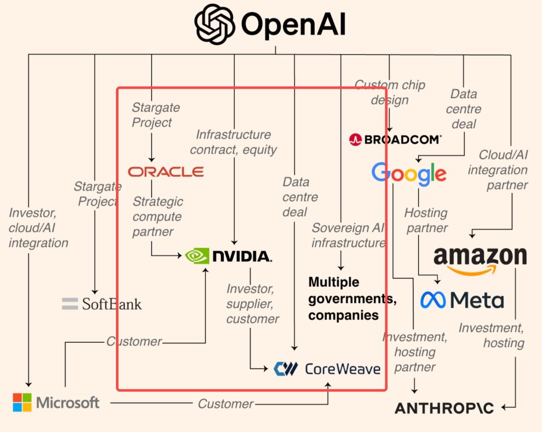 这些公司为OpenAI提供云计算和数据中心,而OpenAI的巨额订单也瞬间点燃了它们的市场价值。