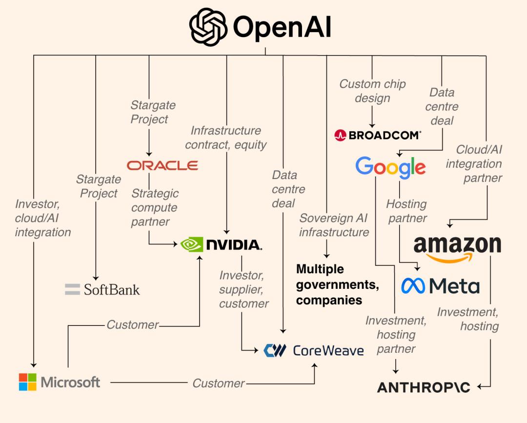 所有连线都表示与OpenAI在资金、算力、托管、芯片或业务上的关系。
