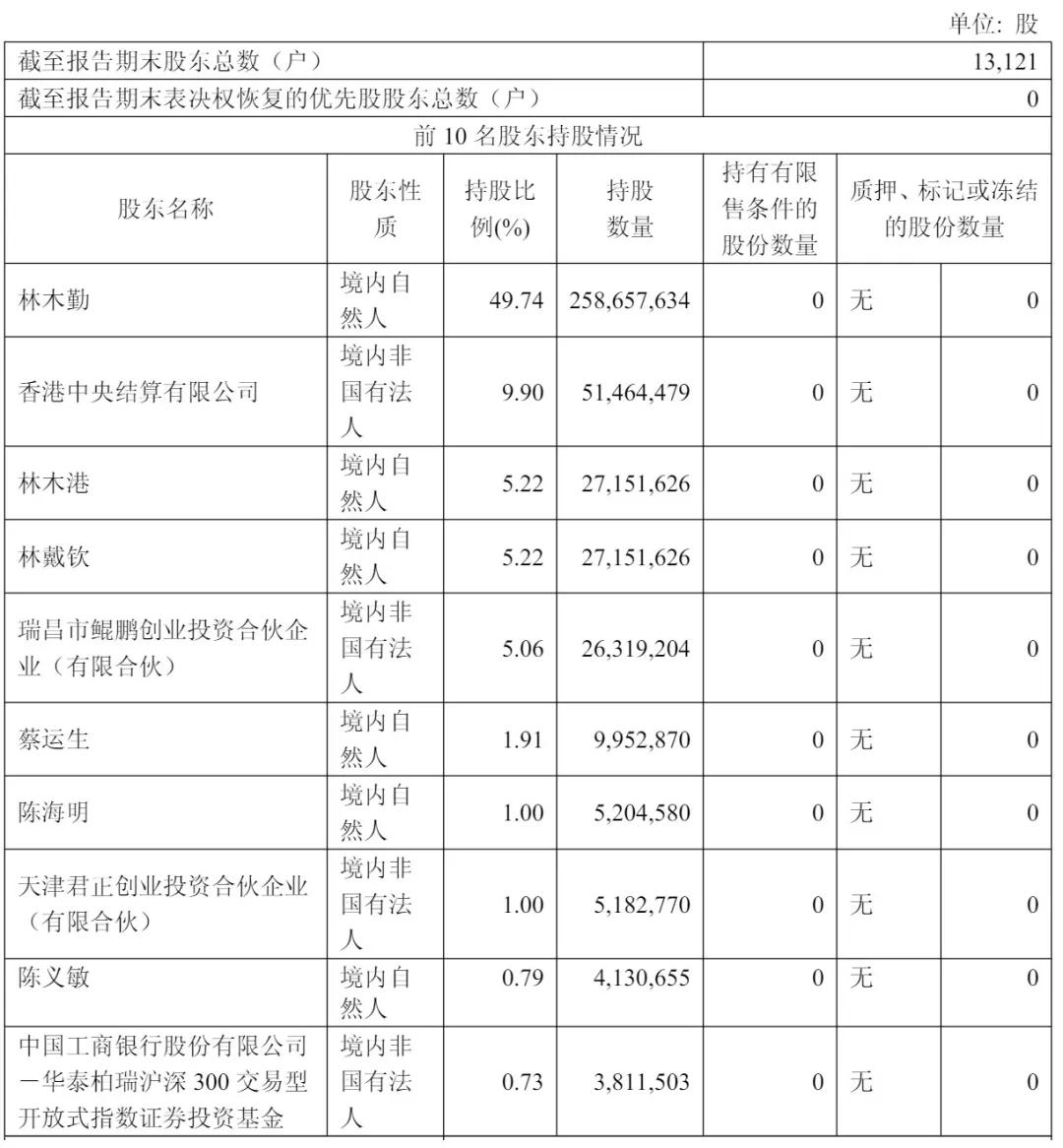 截至2025年6月30日,林木勤持股为49.74%,香港中央结算有限公司持股为9.9%,林木港、林戴钦分别持股为5.22%,瑞昌市鲲鹏创业投资合伙企业(有限合伙)持股为5.06%;