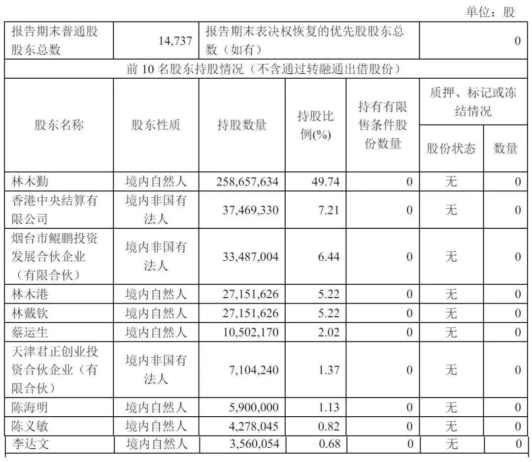 截至2025年3月31日,林木勤持股为49.74%,香港中央结算有限公司持股为7.21%,烟台市鲲鹏投资发展合伙企业(有限合伙)持股为6.44%,林木港、林戴钦分别持股为5.22%,