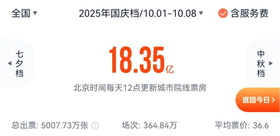 根据灯塔专业版的数据显示,国庆八天总票房停留在18.35 亿元,五部影片过亿,平均票价35.8元,观影人次超过5000万,几乎没什么值得一提的数据表现,票房与2015年(7天)18.62亿靠近, 也因此,各路媒体陆续发出“国庆档票房崩塌”“票房退回十年前”等声调。