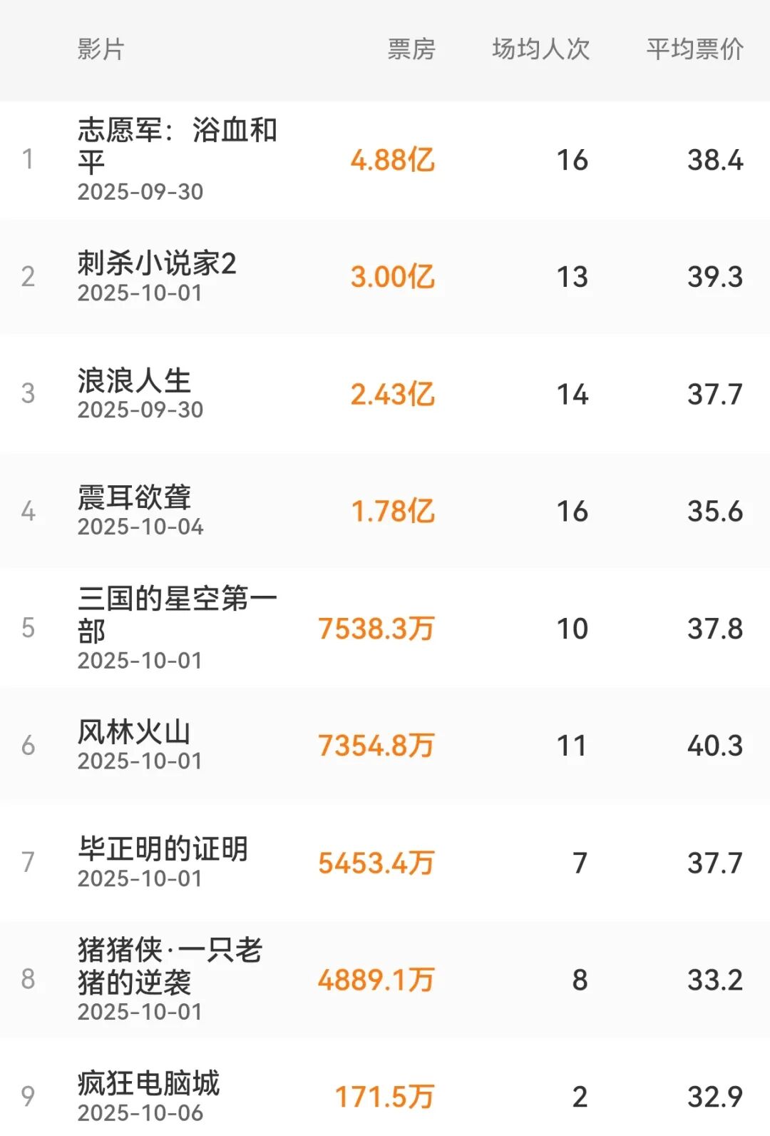 即便 影片宣传相当热闹,社交平台上却无人问津,《志愿军:浴血和平》的“系列收官”并未带来情绪共振,《刺杀小说家2》视觉奇观 、“ 威尼斯影后 ” 和流量艺人 也没能撑起讨论, 《 风林火山 》《 三国的星空第一部 》 无法拉拢定向粉丝的心、更无法走向大众, 而《 毕正明的证明 》《震耳欲聋》虽口碑不错 且有流量热度演员坐镇 ,却只像一阵轻微的回响。