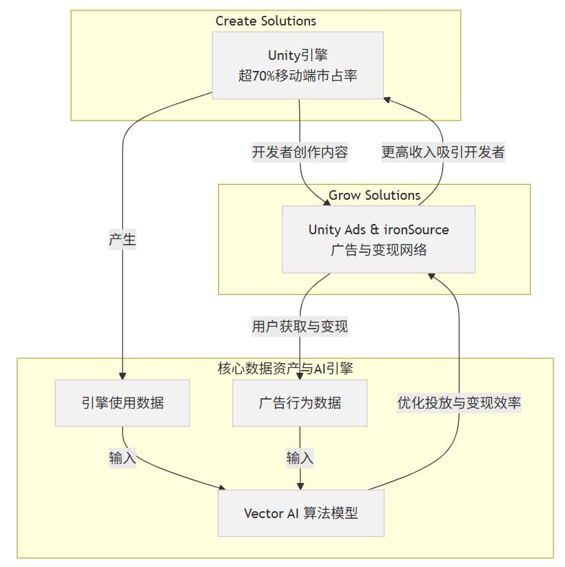 Unity通过Create(创作)和Grow(增长)两大业务构建了独特的“创作-运营”协同飞轮,形成了强大的数据壁垒和网络效应。