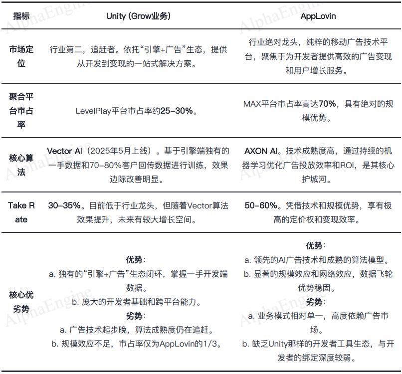 在移动游戏广告技术领域,Unity(Grow业务)与行业龙头AppLovin形成“双雄”格局。