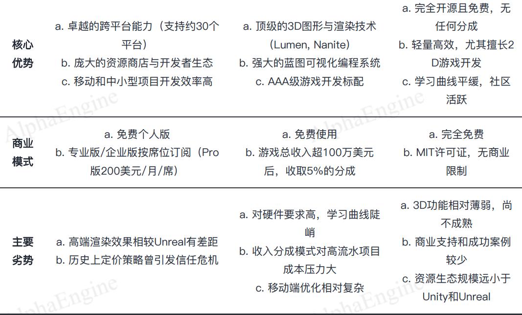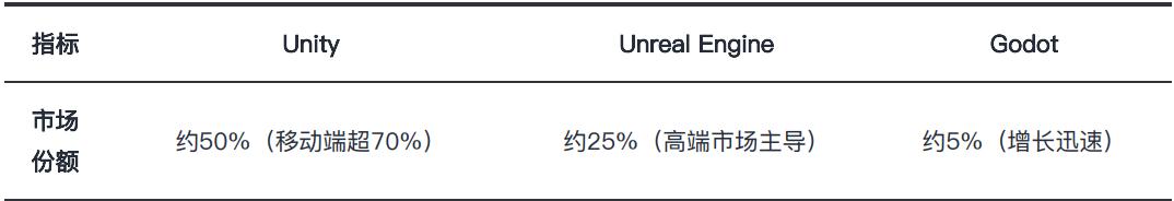 在游戏引擎领域,Unity、Unreal Engine和Godot三大游戏引擎在市场定位、商业模式和技术特性上存在显著差异,形成了差异化的竞争格局。