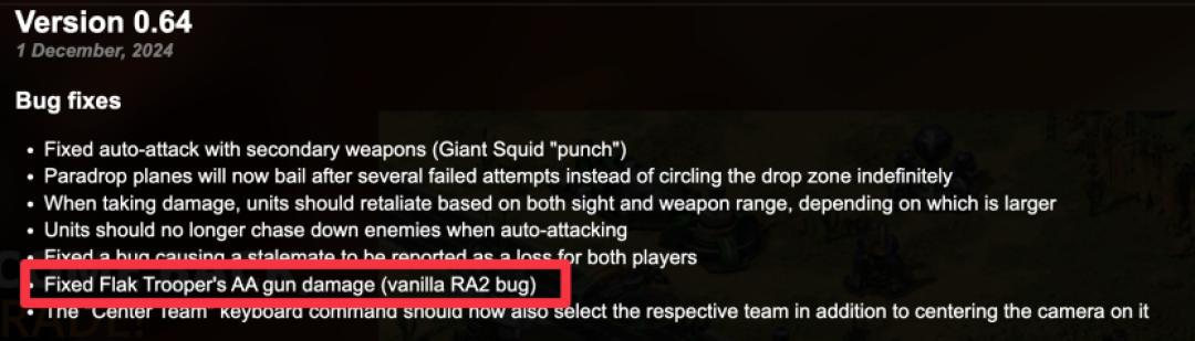 比如 0.64 版本,修复防空步兵对防空炮的伤害(原版《红警2》bug)。