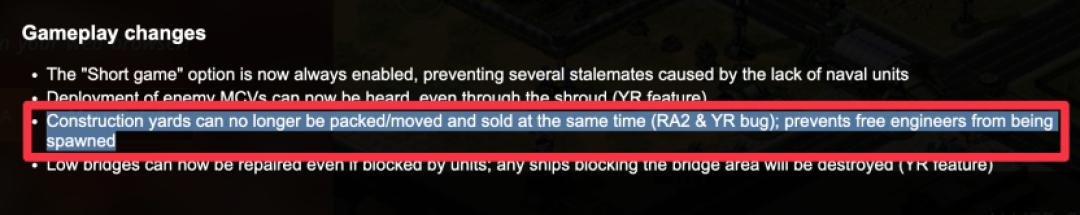 0.18版本,建筑工场不再能够同时被打包/移动和出售(红警2及尤里复仇 bug );防止免费工程师被刷出。