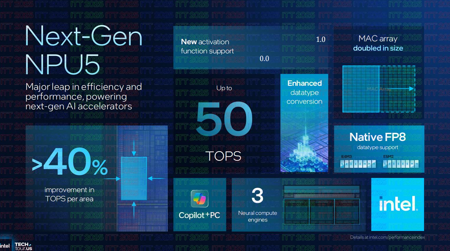 最后我们来聊聊NPU,作为新生代处理器的重要组成部分,Panther Lake的第五代NPU在算力上有了非常大的提升,最高可达50 TOPS,虽然对比GPU的算力来看并不高,但是也已经是前代的数倍。