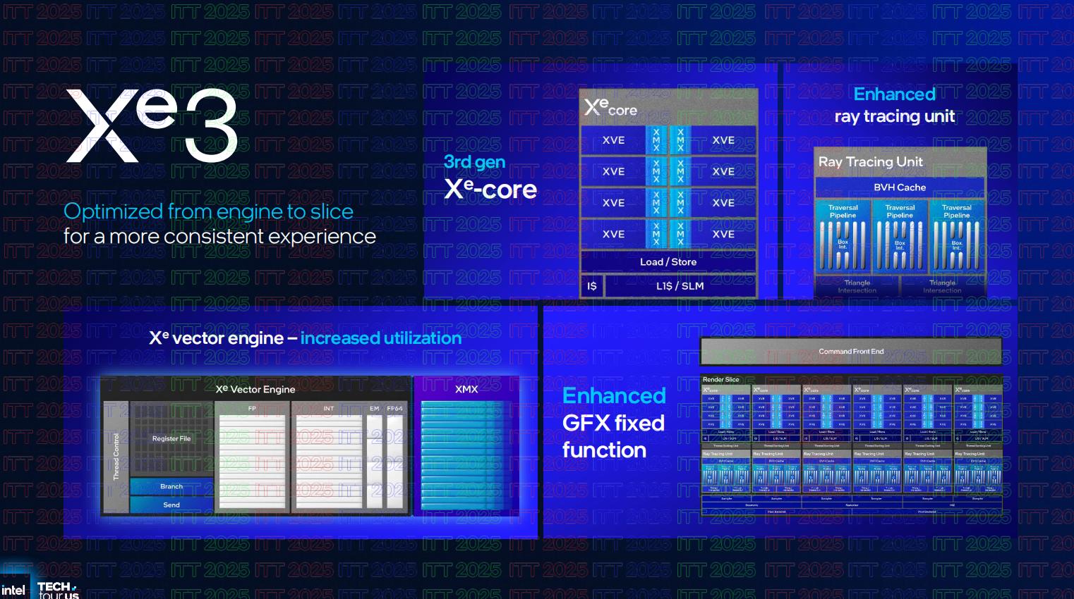 而在GPU方面,Panther Lake则是搭载了全新的Xe3锐炬核显(代号Celestial),这是Intel第3代Xe架构图形单元的首次亮相。与上一代Xe2 (Battlemage)相比,Xe3在架构上进行了大幅升级,核心数量和频率上限都有所提高。