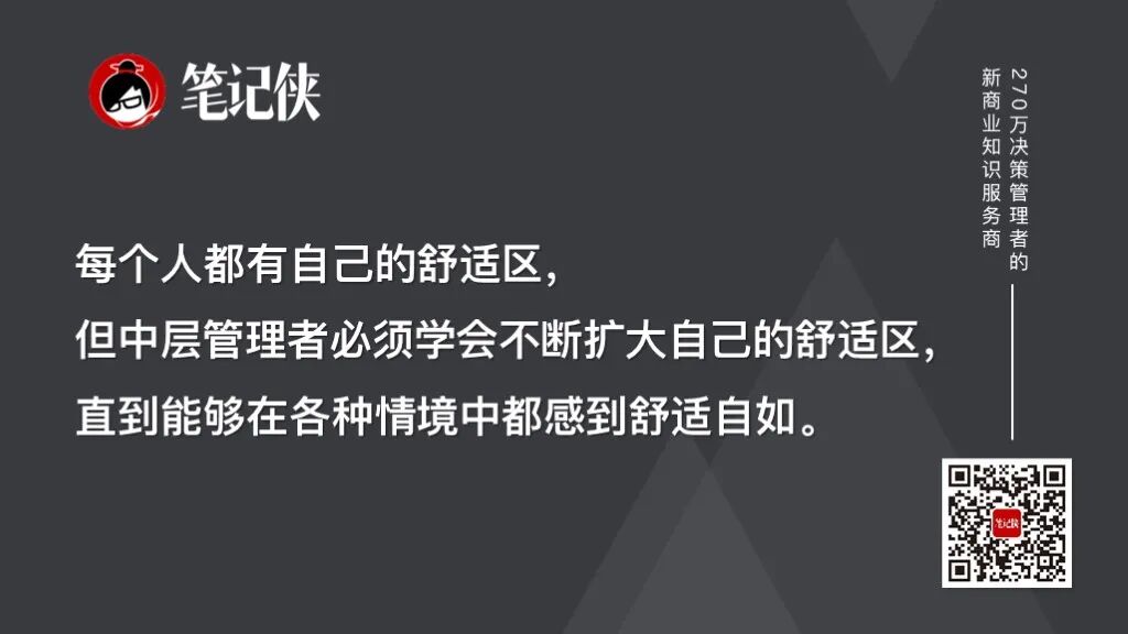 一位咨询公司高管这样说: “每个人都有自己的舒适区,但中层管理者必须学会不断扩大自己的舒适区,直到能够在各种情境中都感到舒适自如。这不是背叛自己,而是成就更好的自己。”
