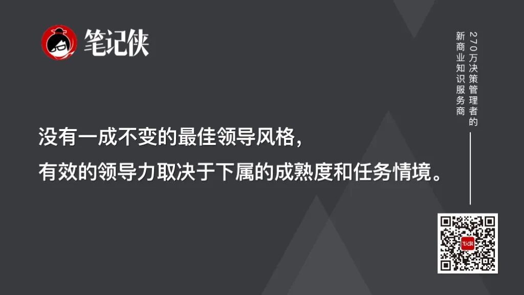 这正契合了著名的赫塞-布兰查德情境领导理论的核心思想—— 没有一成不变的最佳领导风格,有效的领导力取决于下属的成熟度和任务情境。
