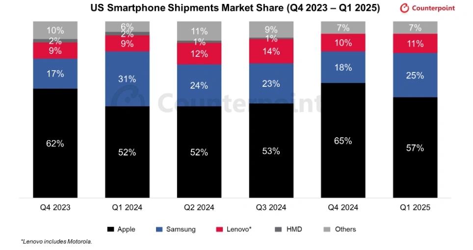 但在雷科技看来,苹果在单一产品线上覆盖如此宽的价格带和产品布局,其实是不得不为的「市场现实」。在全球高端市场,iPhone 的份额几乎已经触顶:以美国为例,iPhone 的市场占有率长期稳定在 60% 左右;而在中国,随着华为、小米等品牌持续发力高端,苹果的增长空间被进一步压缩,小米17 Pro Max 紧急极为火爆的销量就是最好的证明。