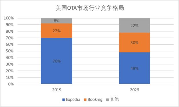 反观曾经的龙头Expedia,其美国本土收入占比长期超过 50%,在欧洲、亚太市场的份额始终难以突破。甚至在美国市场,份额也从7成以上快速下降到不到5成,被Booking等竞争对手蚕食份额。