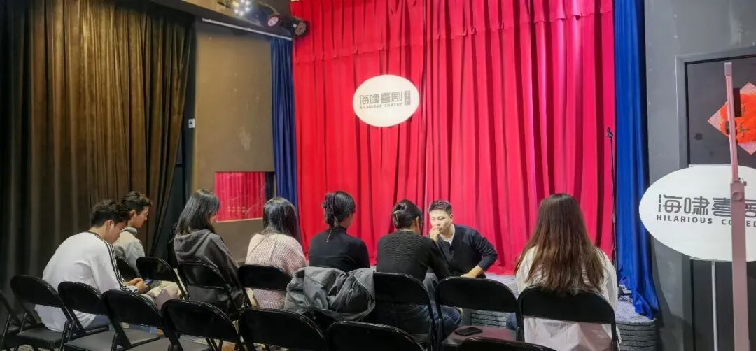 观众刚退完场,可乐已经在舞台边沿上席地而坐,当晚参加演出的其他演员则坐在他对面的观众席里。这是每场开放麦之后例行的复盘环节。“讲一两句话你自己先笑,你是干啥呢,掩饰尴尬?!”灯光下,可乐脸上密密的汗珠清晰可见,板起的脸孔与在刚刚在舞台上时截然不同。