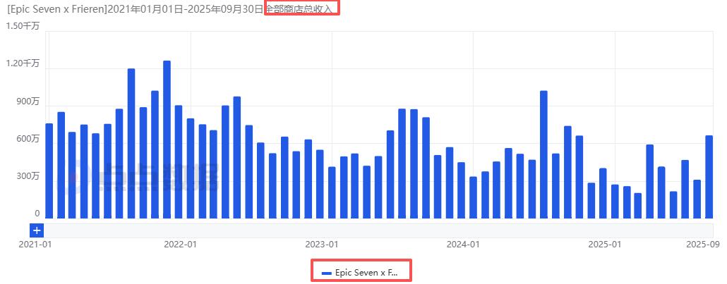 但若说长线,上线于2018年末的《第七史诗》的成绩已经被验证过,2021年至今其累计流水已经来到26亿元(美国、韩国、日本分别占比35.65%、23.18%、10.5%),就趋势而言,一直有所下滑,但速率极低,近半年月流水在1500万元在4500万之间波动。