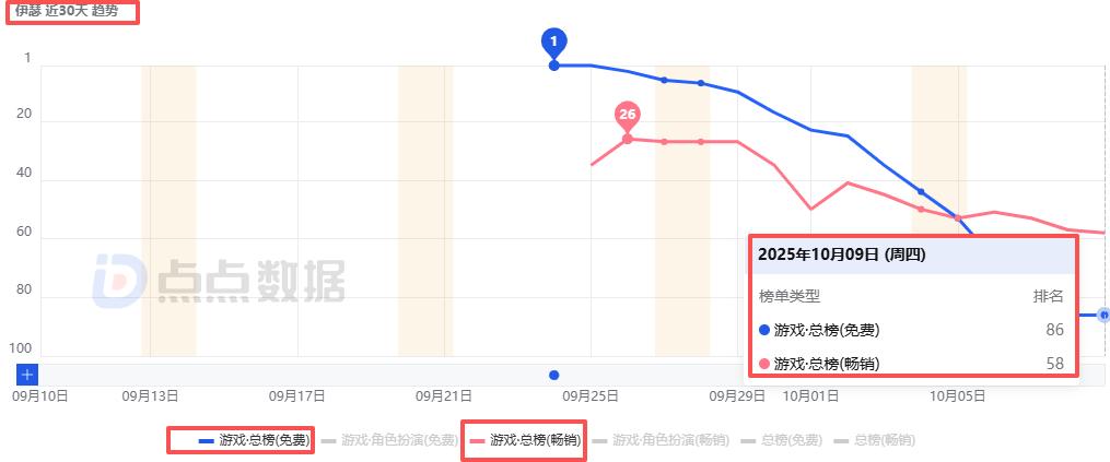 《伊瑟》国服上线至今iOS游戏双榜排名情况
