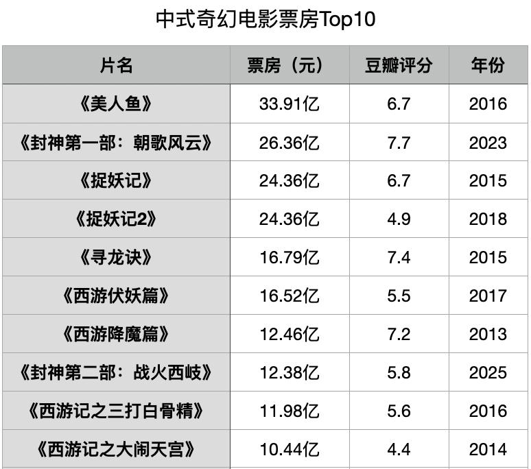 这似乎给国内创作者造成了一种错觉,认为在奇幻题材中,只要塞入足够的搞笑元素,就能掩盖叙事逻辑的硬伤。这种创作上的误区,反映在市场端,便是整个类型片的集体困境。纵观国产中式奇幻电影票房榜Top10,周星驰的《美人鱼》以33.91亿位居榜首,但其后的大量作品,豆瓣评分普遍在4到6分之间艰难徘徊,前十位只有两部过7分。