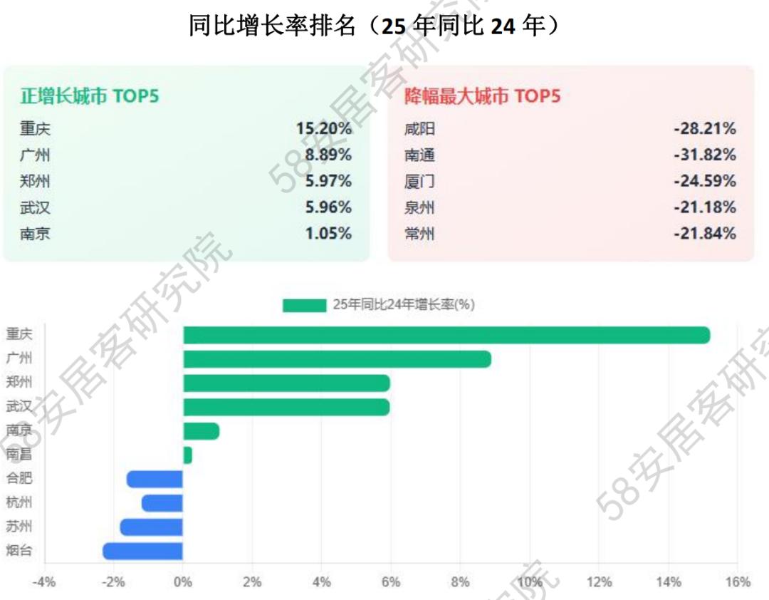 值得关注的是,城市间分化趋势明显。一线城市和新一线城市展现出更强的市场韧性,其中广州、重庆等城市表现尤为突出,其中一线城市中广州实现了8.89%的同比增长;新一线城市中重庆以15.20%的增长率领跑全国。相比之下,二线和三四线城市调整压力仍然较大,特别是南通、咸阳等城市降幅超过30%,市场深度调整特征明显。