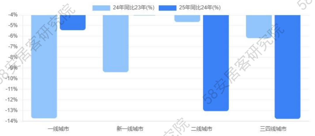 三四线城市:24年同比23年下降6.17%,25年同比24年下降13.78%,降幅扩大7.61个百分点,市场调整持续深化。