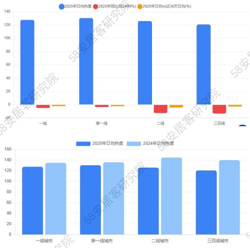 三四线城市:日均热度均值为120.69,较2024年下降13.78%,降幅最大。与近30天均值相比下降3.19%,短期波动较小,但长期调整压力较大。