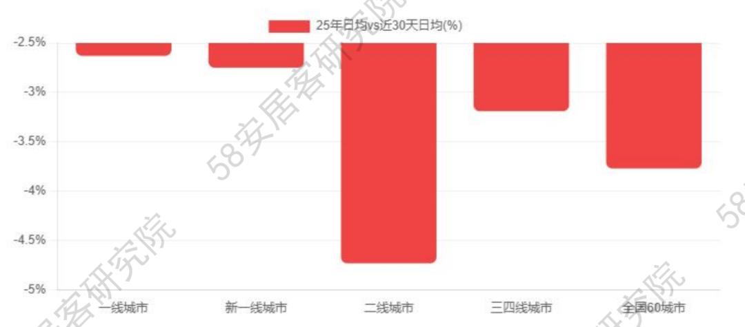 通过对比25年日均vs近30天日均二手房找房热度数据,我们可以直观评估市场短期波动情况。一线城市与近30天均值相比仅下降2.63%, 显示市场稳定性较高;而二线城市下降4.73%,市场波动相对较大。