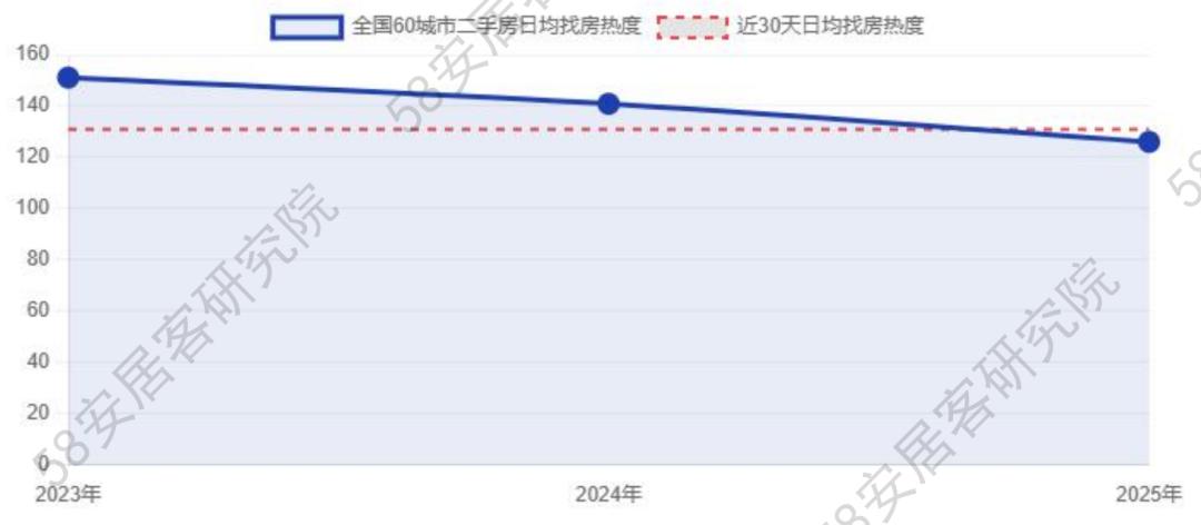 新一线城市:日均热度均值为130.46,较2024年下降4.02%,降幅略低于一线城市,但整体热度水平略高于一线城市。与近30天均值相比下降2.75%,市场表现也较为稳定。