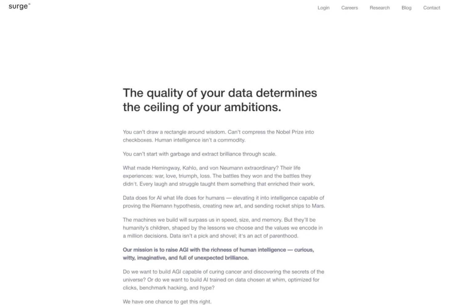比起竞争对手Scale AI,Surge AI显得十分低调,公司主页没有炫酷的互动,只有一堆纯文字介绍,最鲜明的一句是“数据质量决定抱负上限”。