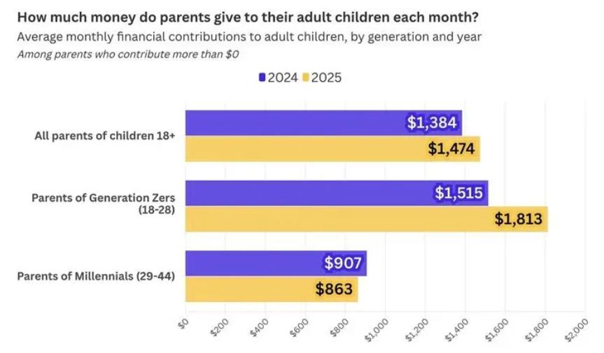 还有一项调查指出,父母每月为成年子女提供的支持正在逐年增加。2024年,父母为18岁及以上子女提供的月均支持为1,384美元,而这一数字在2025年预计将增至1,474美元。