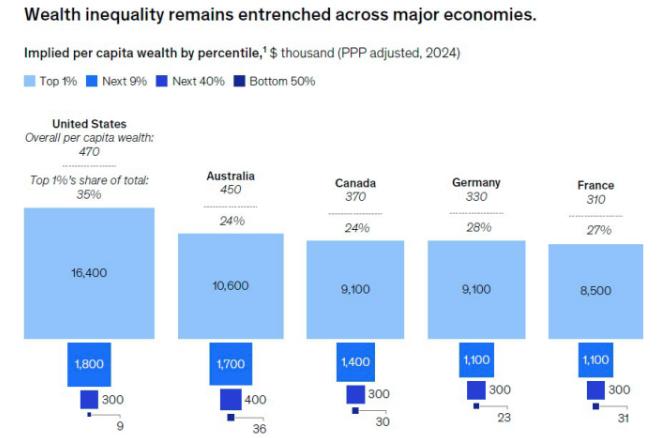 但这一数字与实际经济表现的脱节日益加剧——从25年前的全球GDP的4.7倍扩大至了如今的5.4倍。财富集中度也仍令人震惊:前1%的富翁群体拥有全球五分之一的财富。