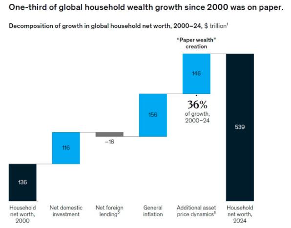 麦肯锡补充称,自本世纪初以来,全球财富增长了400万亿美元,其中超过三分之一基本上只是账面收益,与实体经济脱钩,约40%源自累积通胀。这意味着只有30%反映了实体经济的新投资。或者换句话说,每一美元的新投资创造了3.50美元的新增家庭财富。