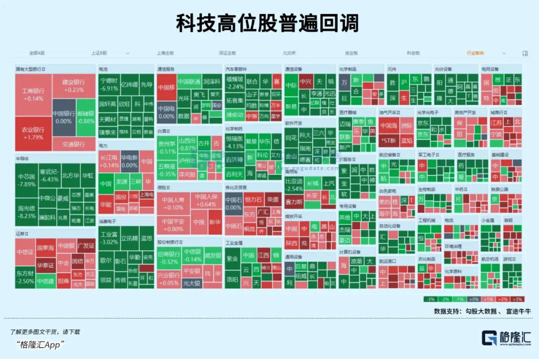 先看盘面,科技股全面杀跌,热门板块如半导体、存储芯片、储能、固态电池跌幅居前,创业板指一度跌超3%,科创50一度跌超4%。