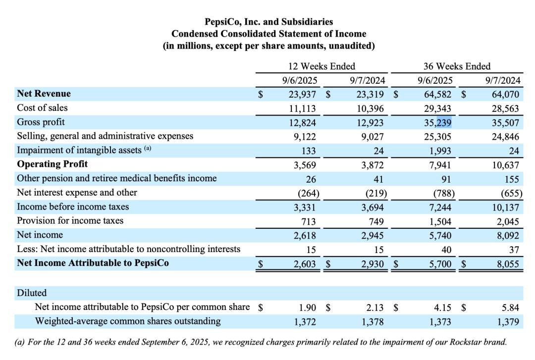 昨日,百事公司发布2025年第三季度财报。报告期内,营收同比增长2.6%至239.4亿美元(折合人民币约1746.42亿元),超出华尔街预期。其中,公司北美零食和饮料销量下滑,拉美和亚洲市场销量上升。唯独中国市场既没有被单独点名表扬,也没有详细数据披露,只在“包括中国”等字眼中一笔带过。