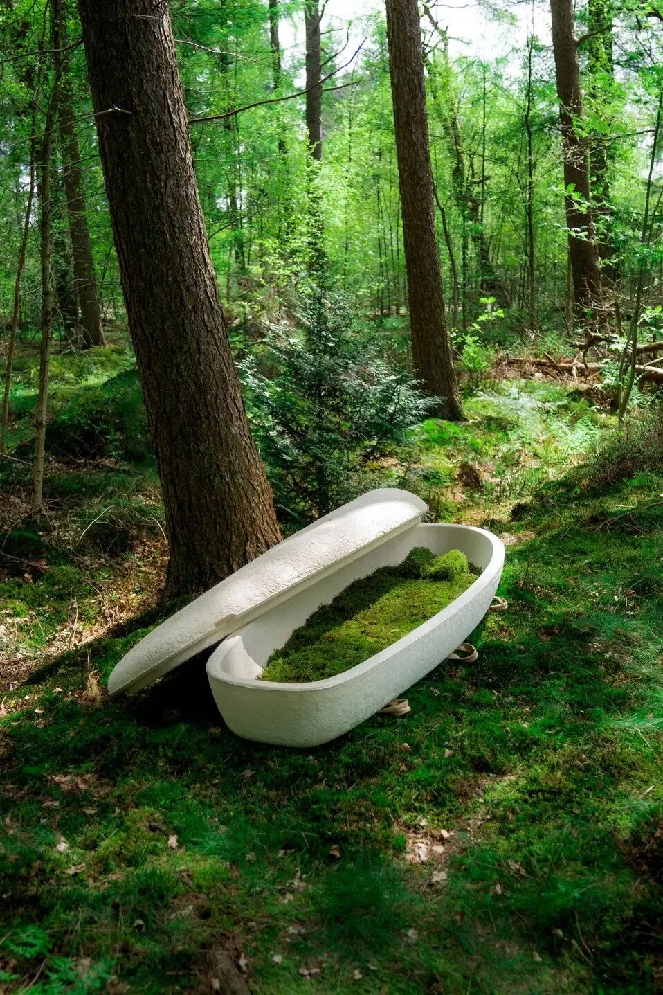 循环再生茧(Loop Living Cocoon) 是一种由蘑菇,和大麻纤维制成的可生物降解、内衬苔藓的棺材,它的设计目的是,即使在我们离开后,仍能积极滋养自然。