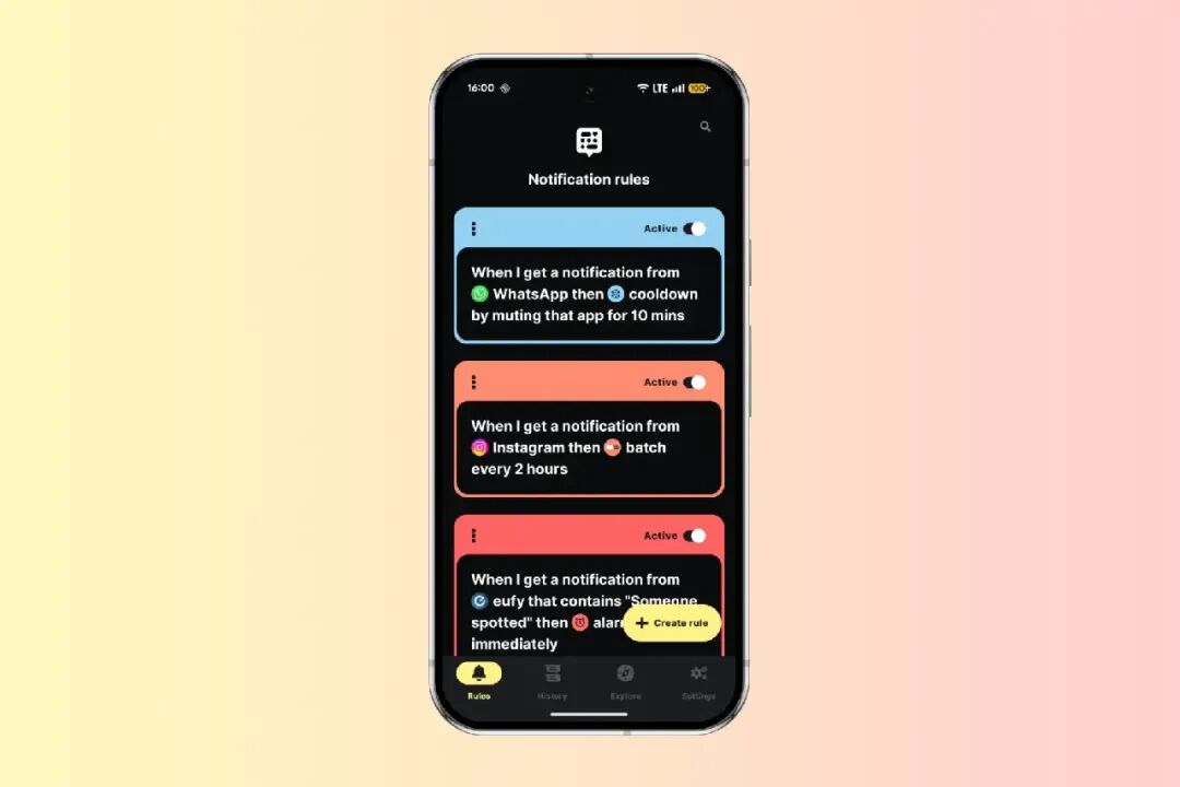主要的工作原理是,让用户创建复杂的规则,来筛选通知。具体包括选择应用程序、关键词过滤、群组聊天属性等条件。用户还可以定义规则的执行动作,例如静音特定通知、确保重要通知绕过静音模式,或通过集成工具 Tasker 实现更高阶自动化。