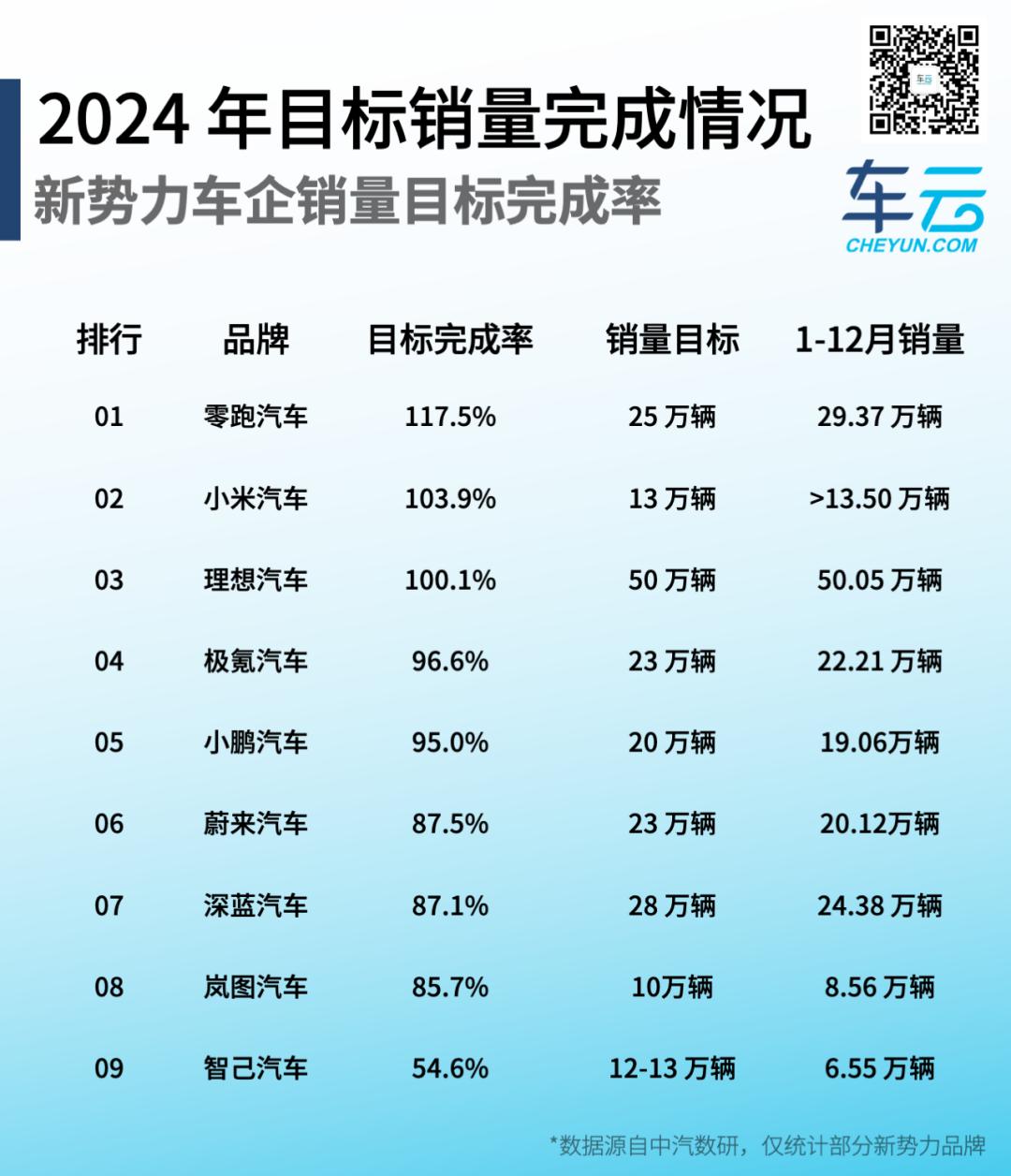 都说今年汽车行业特别卷,其实从销量情况也能看出来。对比今年,2024年新势力车企目标完成率要整体更好。今年各家车企对销量目标做了不同幅度的上调,其中零跑汽车2025年销量目标较2024年提高一倍,小米汽车目标销量更是提高了近两倍,蔚来、理想和小鹏也都有不同程度的上调,其中蔚来今年的销量目标相比去年几乎翻倍。