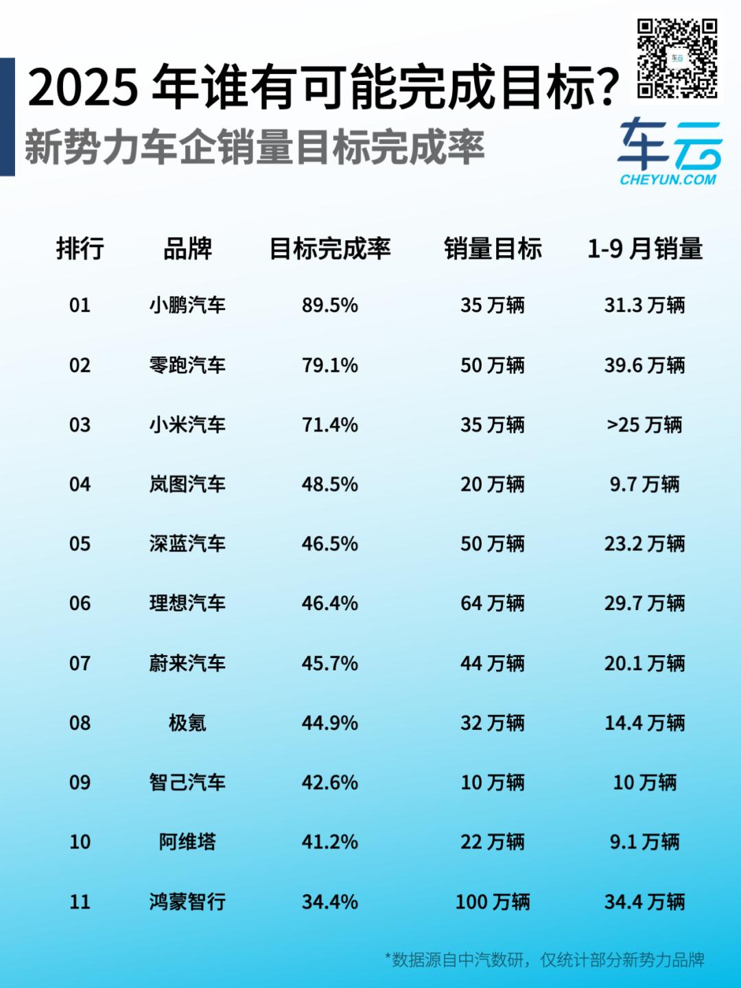 在造车新势力阵营中,小鹏不声不响以89.5%的目标完成率暂居榜首。截至2025年9月,小鹏累计销量达31.3万辆,超额完成35万辆年度目标。这一成绩的取得,得益于其“做精、做少、做差异、做全球”的产品战略,以及在智能驾驶领域的持续突破,同时也和小鹏相对务实的目标设定有较大关系。