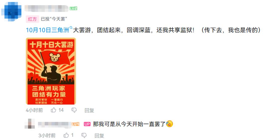 一瞬间,这在三角洲玩家圈掀起了声势浩大的讨论。截至发稿前,三角洲在B站发布的“烽火地带平衡性调整公告”评论已高达55.5万条,且不少评论主要为“炎上”类。甚至有一部分情绪上头的玩家,发起了“10月10日大罢游”的活动,抖音上