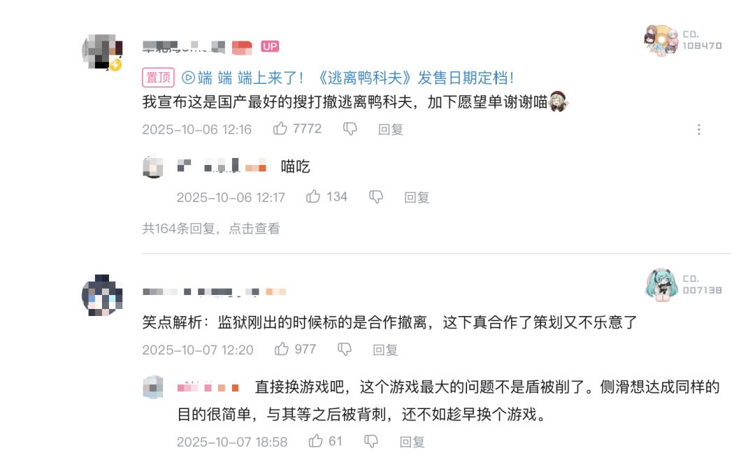 “限制5人,也就意味着有一个小队的一个人要留下来?三角洲本就是注重熟人社交的产品,你觉得到时候留谁下来合适?”针对“限制撤离”一事Tycoon认为,“这不仅会影响囤囤鼠的体验,让游戏缺失一部分玩法,也有可能会激发队内矛盾。”