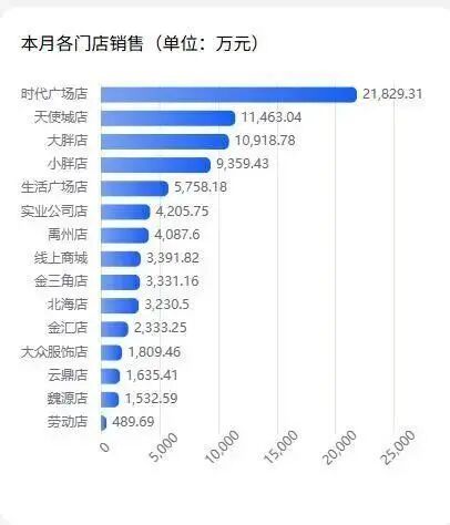 从本月各门店表现来看,胖东来时代广场店依然断档式领先,本月销售额约2.18亿元,天使城店、大胖店、小胖店则分别以约1.14亿元、约1.09亿元、约9359万元的销售额紧随其后。