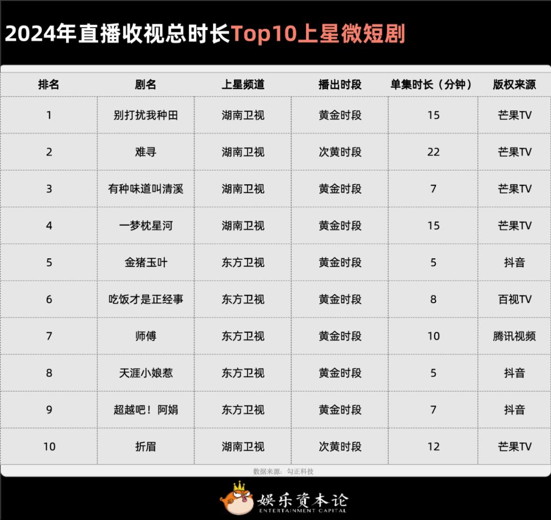 在大屏“适短化”与响应广电号召的平衡点上,从央视到一线卫视纷纷开设微短剧直播节目档,勾正科技给出的2024年直播收视总时长Top10上星微短剧中,湖南卫视与东方卫视表现出众;版权来源中,芒果TV的中剧(横屏微短剧)占据半壁江山。