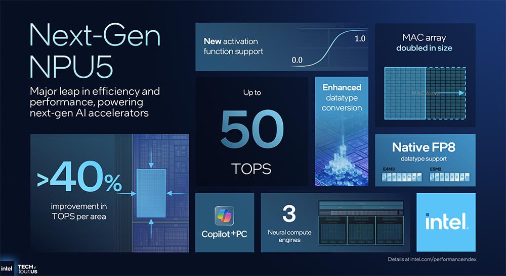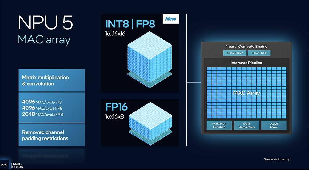 具体来看英特尔NPU 5架构。英特尔认为上一代NPU4的设计不够高效,因此在NPU 5进一步缩小面积,并简化了后端功能,通过MAC阵列规模翻倍,把单位面积性能提升40%。